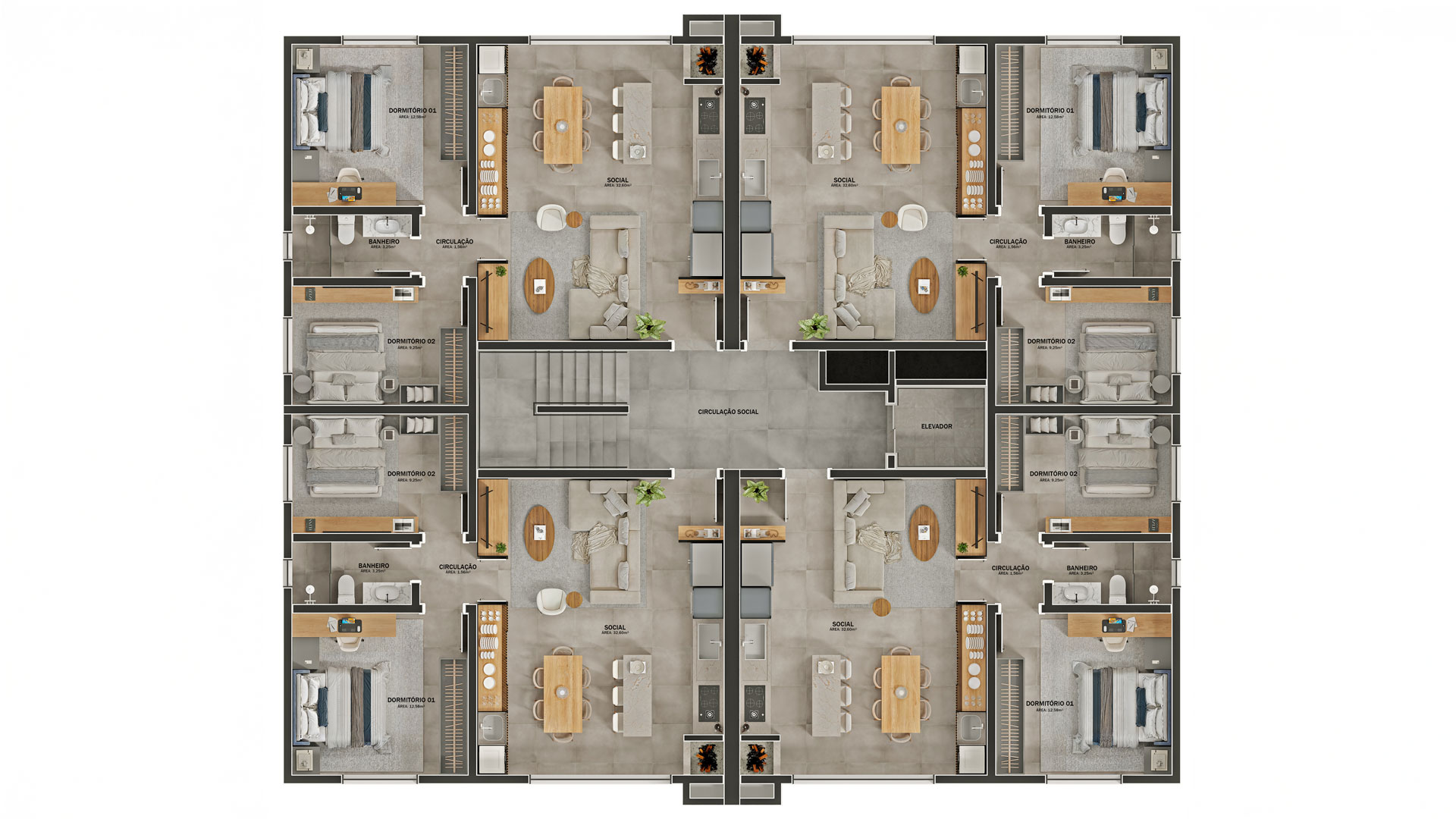 Todos as suítes terão vista livre, e os banheiros terão ilum